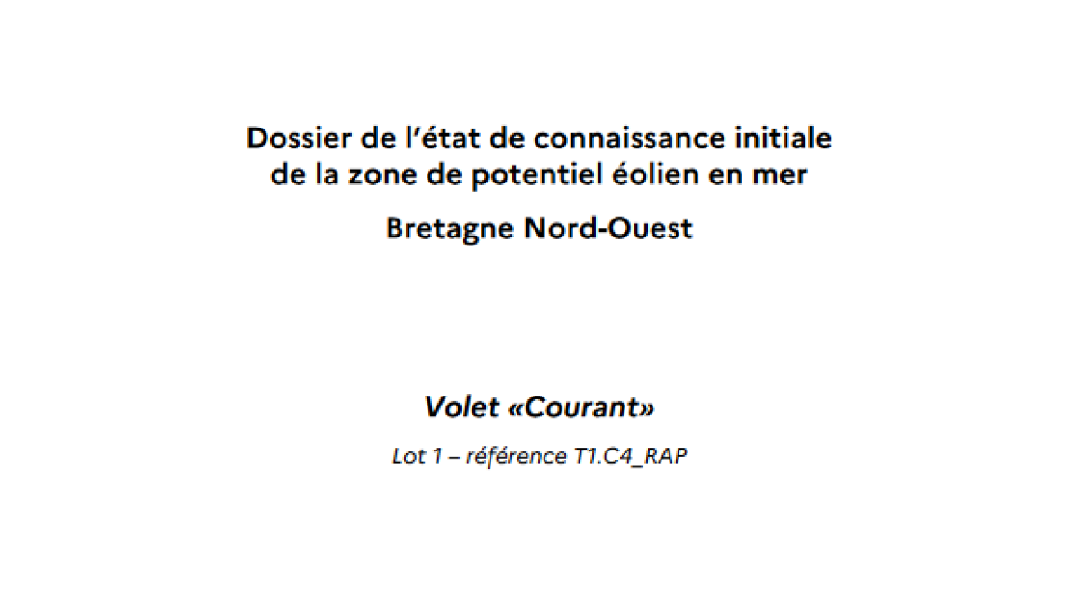 Ce rapport fournit un état des lieux de la connaissance en courantologie sur la zone d'étude pour l'implantation d'un parc éolien en zone Bretagne Nord Ouest.