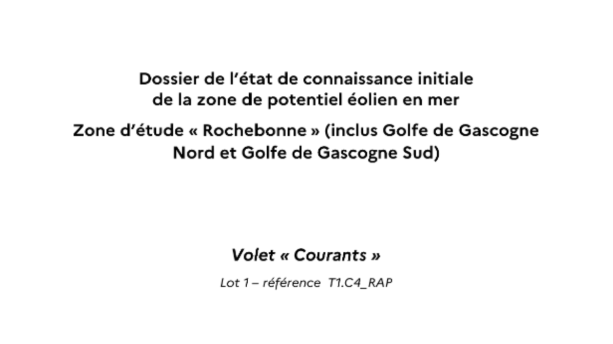 Ce rapport fournit un état des lieux de la connaissance en courantologie sur la zone d'étude pour l'implantation d'un parc éolien en zone Golfe de Gascogne