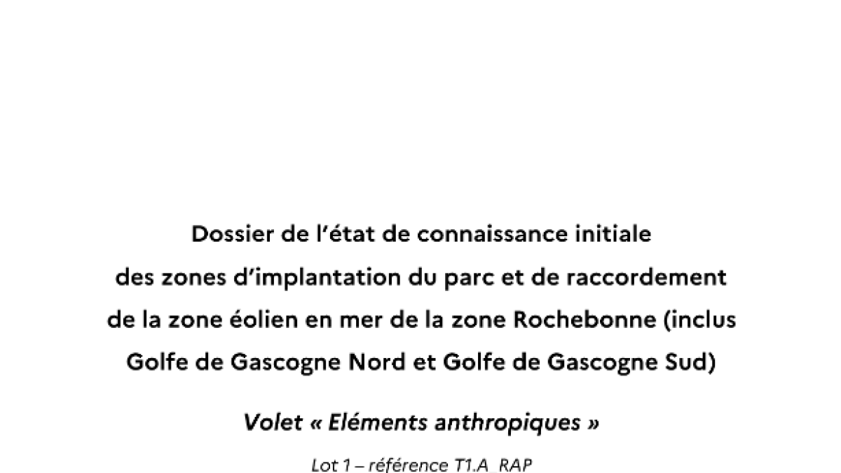 Ce rapport contient les données sur les éléments anthropiques extraites de la Base de Données Générale du SHOM sur une emprise englobant la zone d'étude Golfe de Gascogne. Ces données concernent les épaves et obstructions, les câbles et conduites sous-marines ainsi que les zones réglementées.