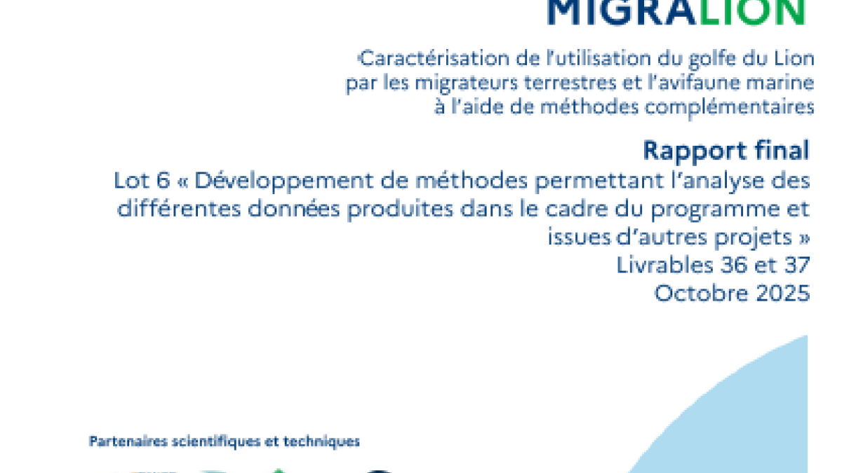Ce document correspond au rapport final méthodologique et d'analyses du lot 6 "Développement de méthodes permettant l'analyse des différentes données produites dans le cadre du programme et issues d'autres projets" du programme MigraLion. Il présente l'ensemble des résultats finaux acquis par le lot 6 du programme MigraLion incluant les données acquises par les lots 3 (télémétrie), 4 (campagnes nautiques) et 5 (radars ornithologiques) pendant 3 années consécutives.