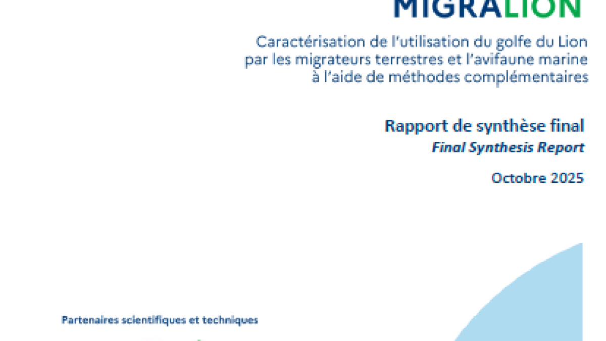 Ce document est une synthèse des principaux résultats finaux du programme MigraLion, construite sur la base des résumés (en français) et des abstracts (en anglais) des rapports finaux des lots d'acquisition des données (lot 3 télémétrie, lot 4 campagnes nautiques et lot 5 radars ornithologiques), et du lot 6 d'analyses globales.